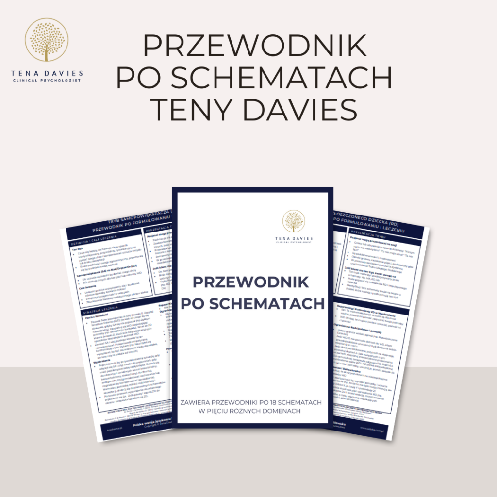 Każdy z 18 zawartych w komplecie Przewodników po Schematach to jedna strona cyfrowego materiału, który wyjaśnia kluczowe cechy schematów oraz ich różnice (np. defektywność a porażka). Opisuje cele terapii, typowe zachowania klientów, oraz wskazuje schematy i tryby, które mogą wystąpić jednocześnie. Przewodniki oferują zalecenia terapeutyczne, koncentrując się na technikach doświadczeniowych i ograniczonym “rodzicielstwie na nowo”.